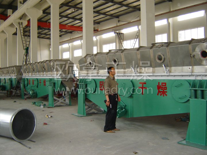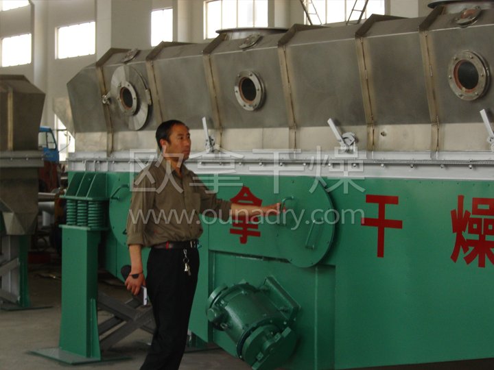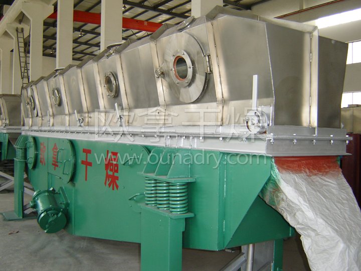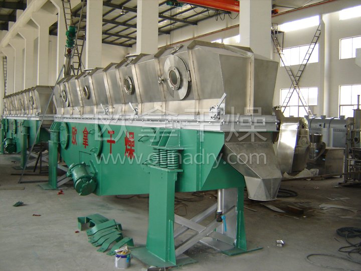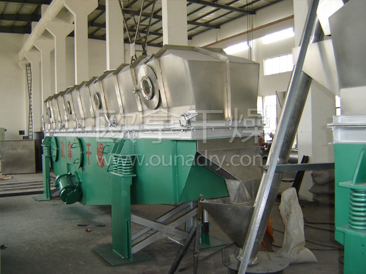 物料自進(jìn)料進(jìn)口進(jìn)入機(jī)內(nèi),在振動力作用下,物料沿水平面流化床拋擲,向前連續(xù)運動,熱風(fēng)向上穿過流化床同濕物料換熱后,濕空氣經(jīng)旋風(fēng)分離器除塵后由排風(fēng)1:3排出.干燥物料由排料進(jìn)口排出。