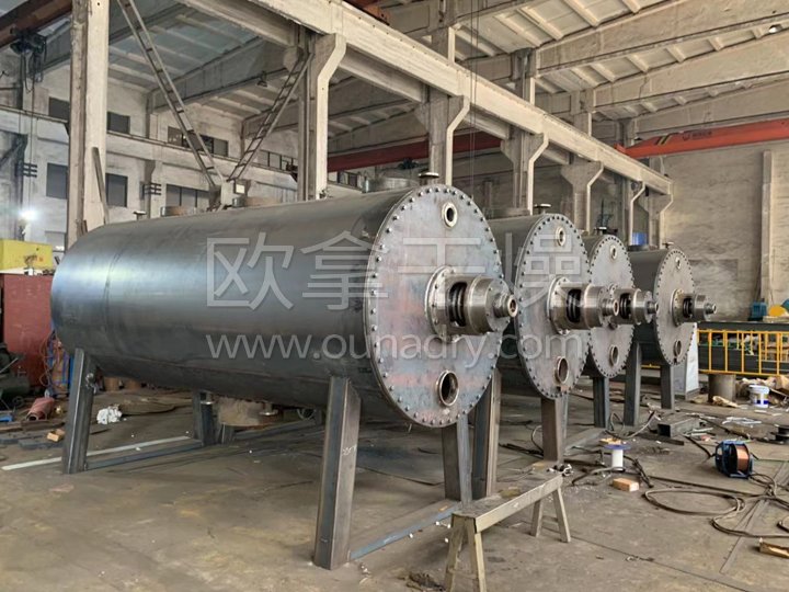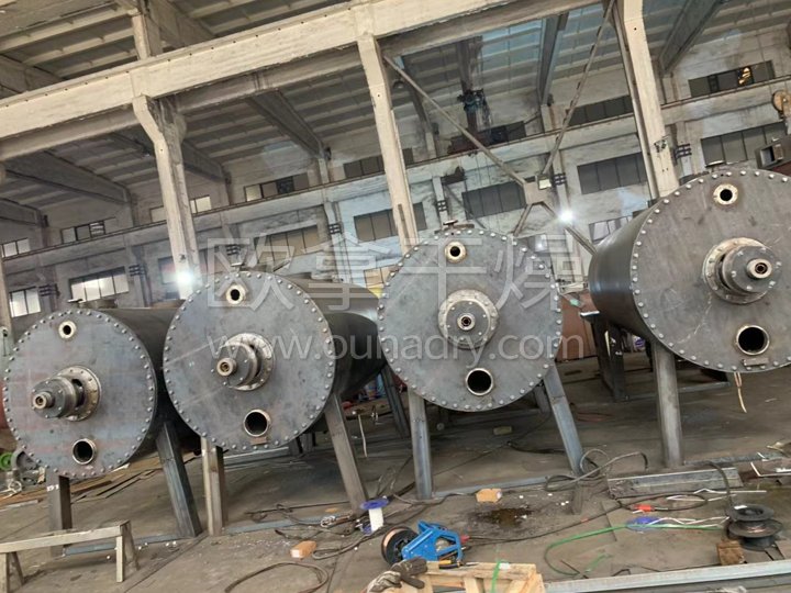 本機(jī)是一種新穎臥式間歇式真空干燥設(shè)備,濕物料經(jīng)傳導(dǎo)蒸發(fā),帶有刮板攪拌器不斷清除熱面上的物料,并在容器內(nèi)推移形成循環(huán)流,水份蒸發(fā)后由真空泵抽出。